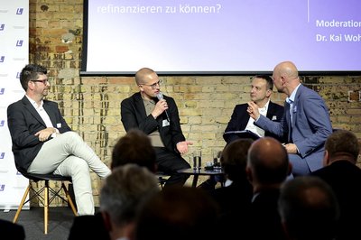 In der Podiumsdiskussion unter Leitung von Referatsleiter Dr. Kai Wohlfarth diskutierten Kai Becker, GLS Bank, Thomas Ullrich, DKB, und Darius Schwierz, Beresa Leasing, über die Refinanzierung von Transformations-Assets. Die aktuelle Investitionszurückhaltung führen die Diskutanten auf geopolitische und konjunkturelle Verunsicherung der Kunden sowie die wenig planbare Förderkulisse zurück.